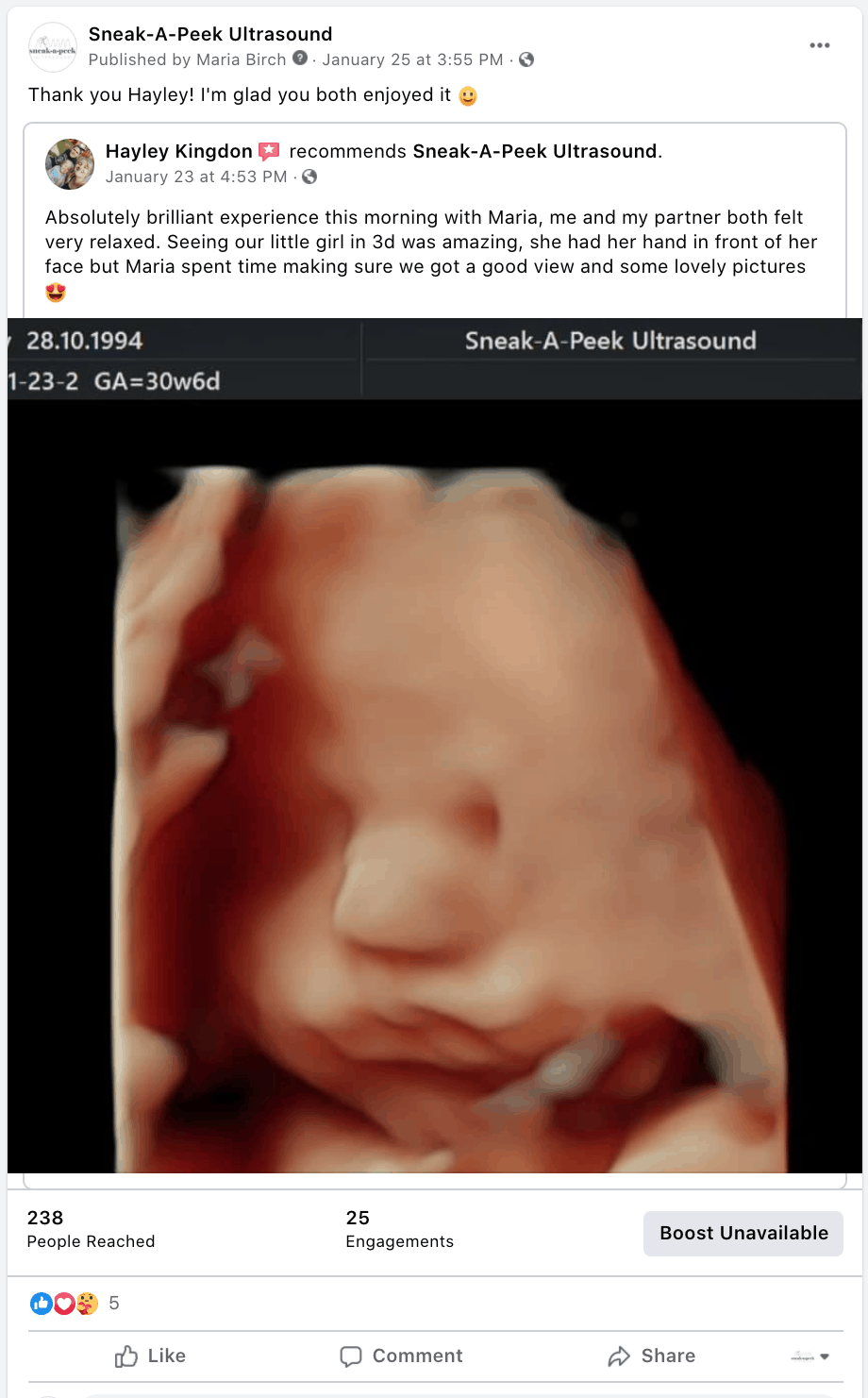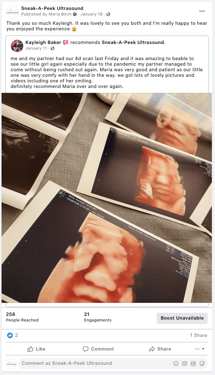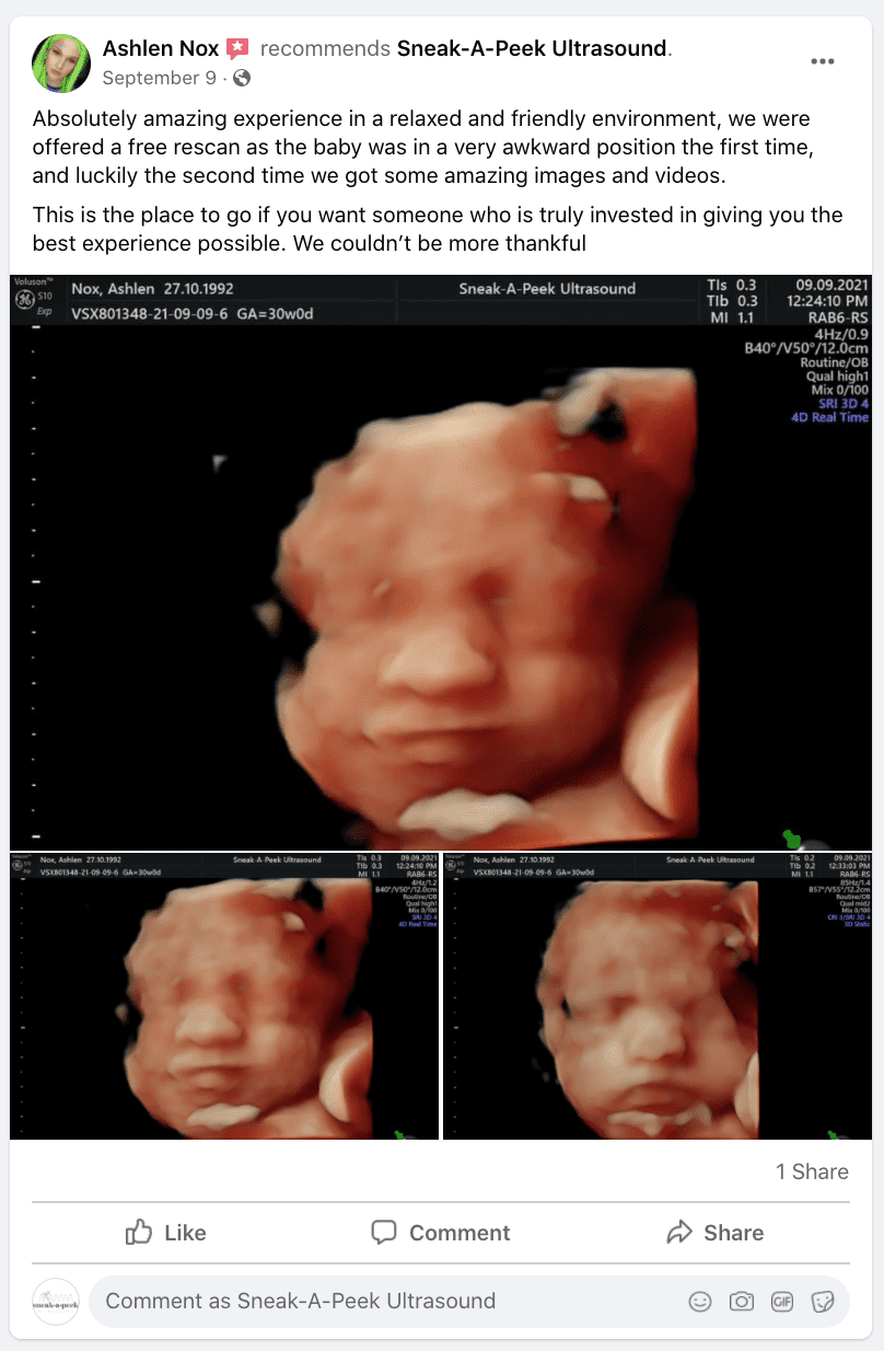 Facebook reviews from happy clients after 4D Baby Scans at Sneak-A-Peek Ultrasound.